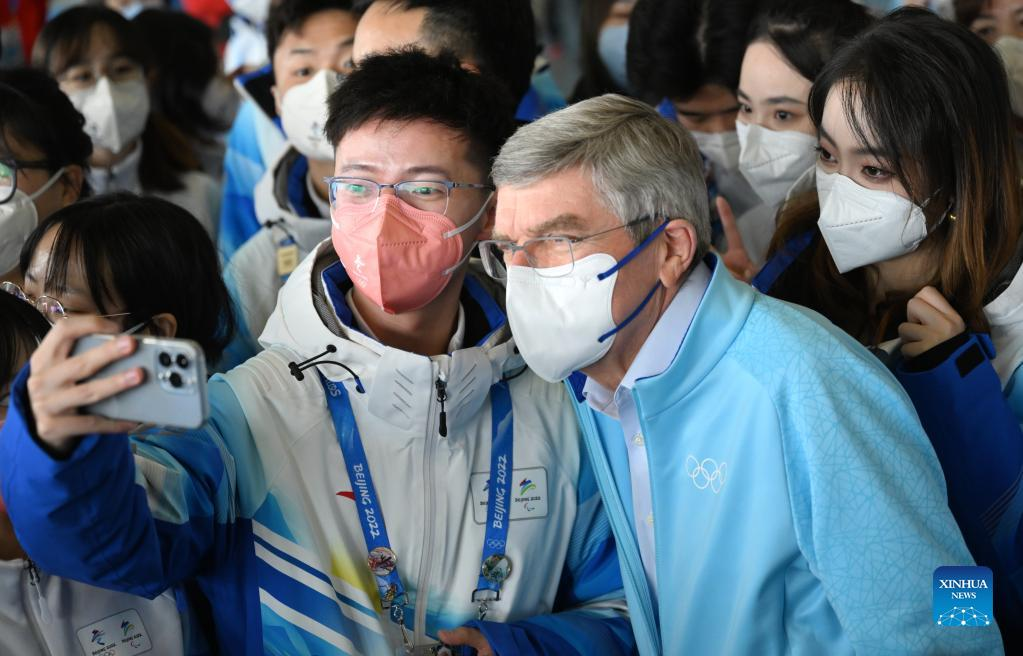 The International Olympic Committee President Thomas Bach (2nd R) poses for a selfie with the volunteers of the Beijing 2022 Olympic Winter Games at the Main Media Center for the Games in Beijing, capital of China, Feb. 18, 2022. (Xinhua/Li Yibo)