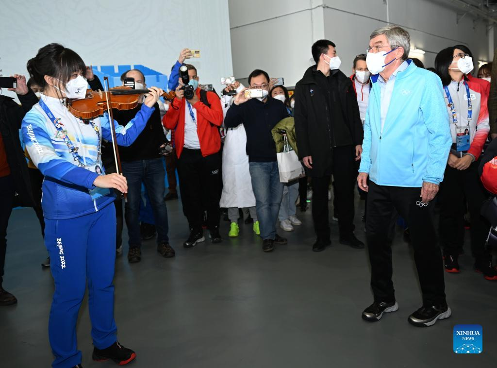 The International Olympic Committee President Thomas Bach talks with the volunteers of the Beijing 2022 Olympic Winter Games at the Main Media Center for the Games in Beijing, capital of China, Feb. 18, 2022. (Xinhua/Li Yibo)