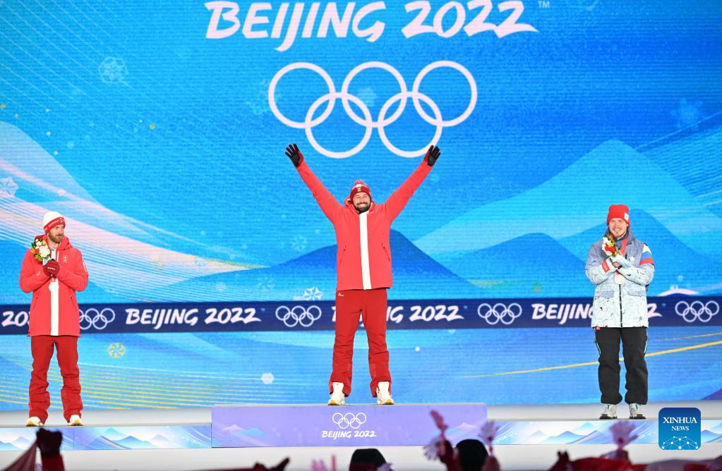 Gold medalist Ryan Regez (C) of Switzerland, silver medalist Alex Fiva (L) of Switzerland and bronze medalist Sergey Ridzik of ROC react during the awarding ceremony of freestyle skiing men's ski cross at Zhangjiakou Medals Plaza of the Winter Olympics in Zhangjiakou, north China's Hebei Province, Feb. 18, 2022. (Xinhua/Zhu Zheng)