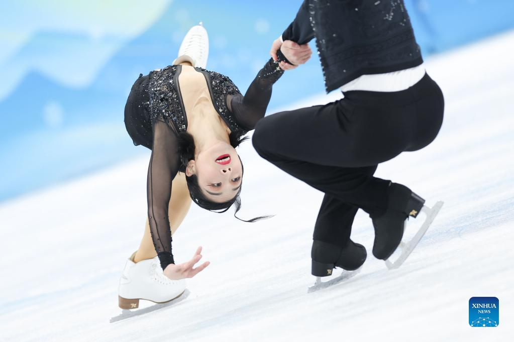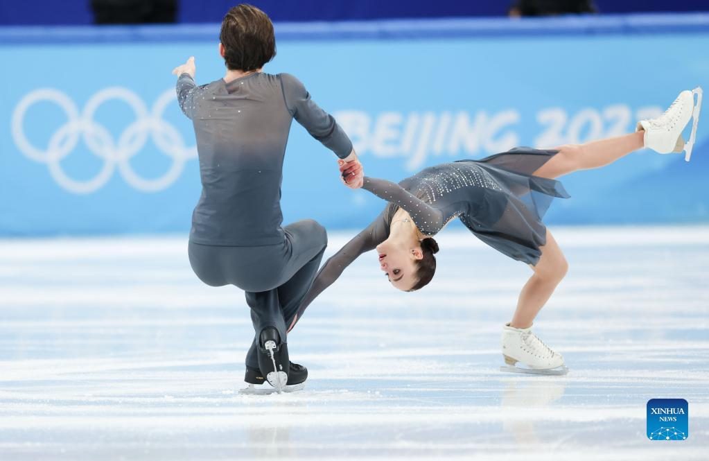 Karina Safina (R) /Luka Berulava of Georgia perform during the figure skating pair skating short program at Capital Indoor Stadium in Beijing, capital of China, Feb. 18, 2022. (Xinhua/Cao Can)