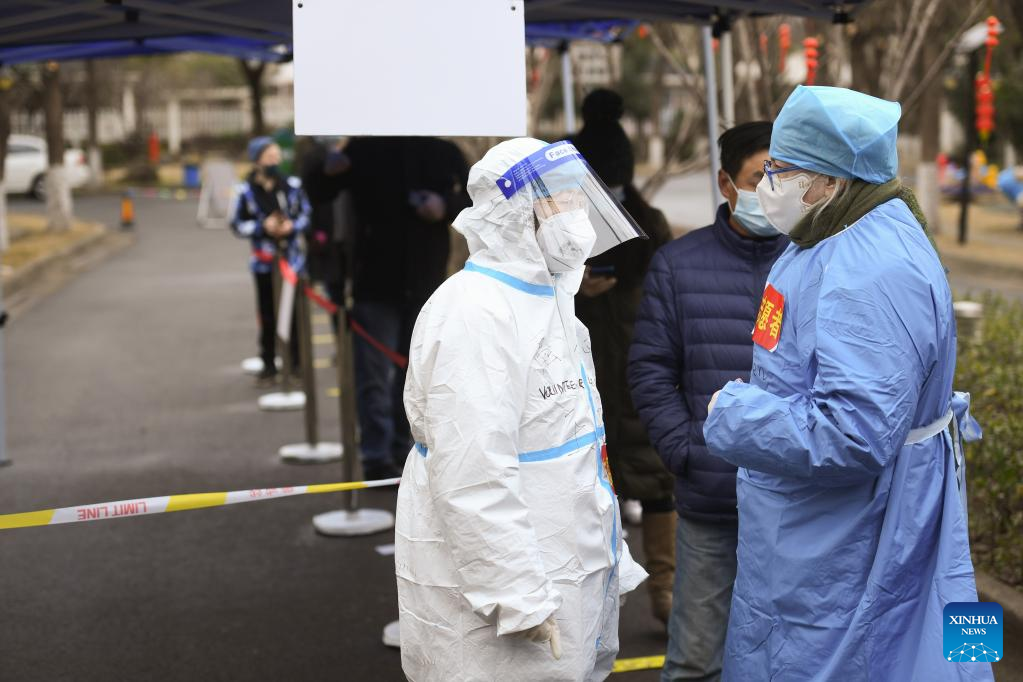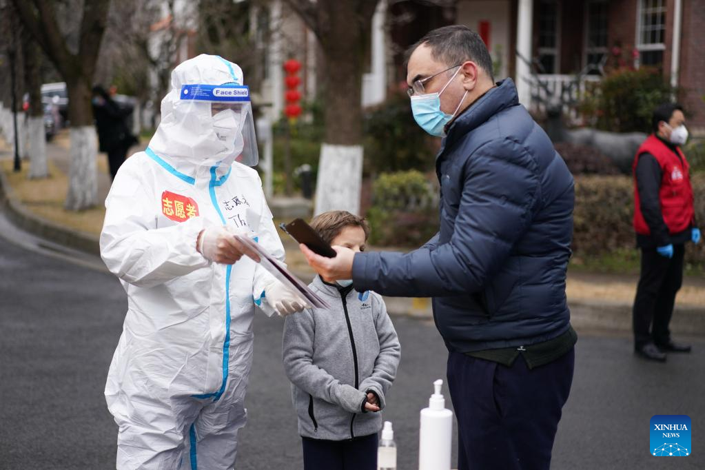 Volunteer Wu Qiong registers information for residents at a COVID-19 testing site in the Suzhou Industrial Park in Suzhou, east China's Jiangsu Province, Feb. 18, 2022. The Suzhou Industrial Park launched its third round of COVID-19 nucleic acid testing on Friday. In order to facilitate foreigners living in the region to take COVID-19 tests, American volunteers Ellen Touchstone and Dinh Thang, together with other language volunteers, provided service at the COVID-19 testing site, helping fight against the latest COVID-19 resurgence in Suzhou. (Xinhua/Ji Chunpeng)