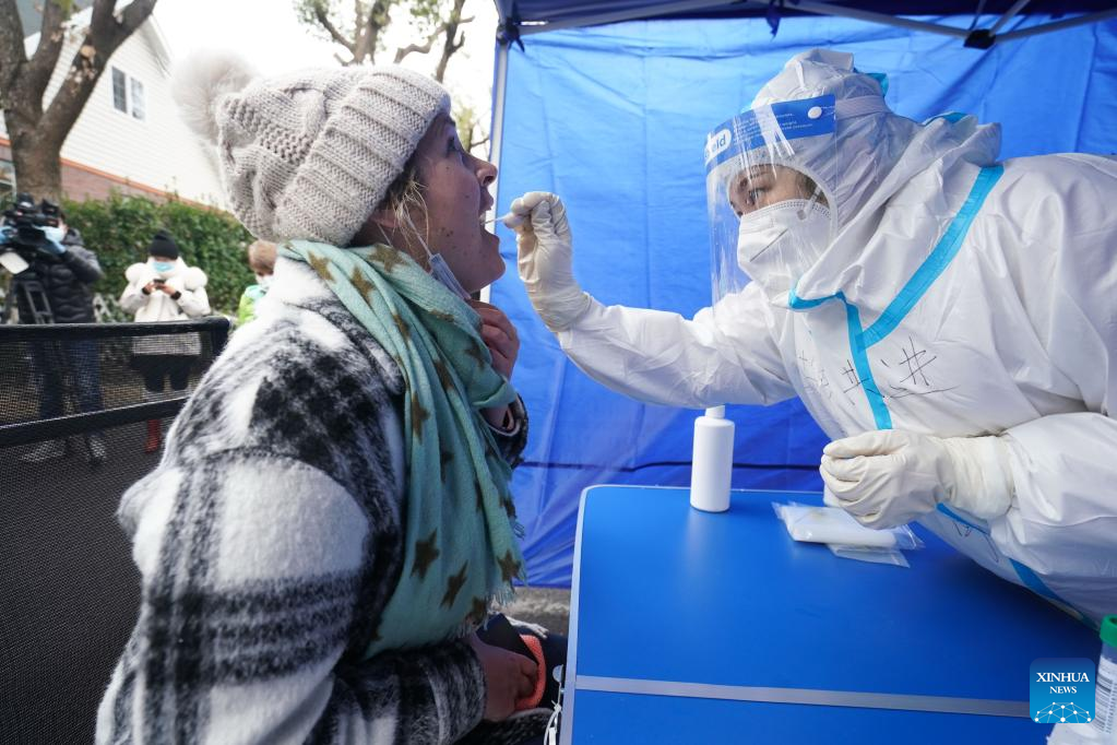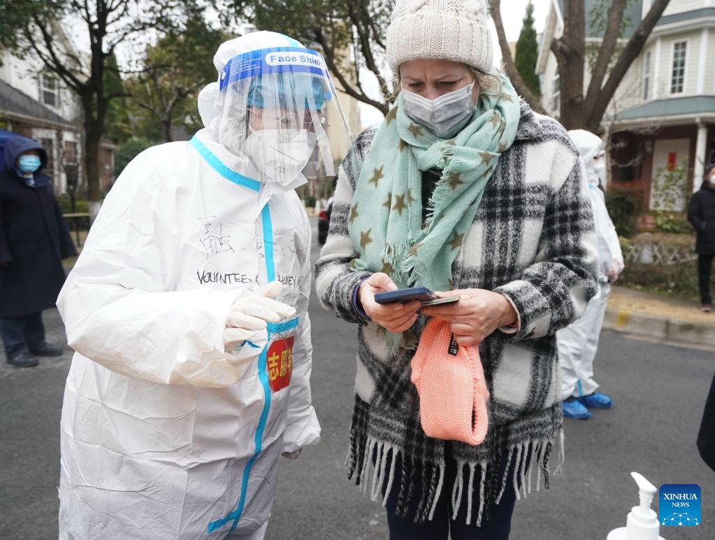A foreign resident takes COVID-19 test at a COVID-19 testing site in the Suzhou Industrial Park in Suzhou, east China's Jiangsu Province, Feb. 18, 2022. The Suzhou Industrial Park launched its third round of COVID-19 nucleic acid testing on Friday. In order to facilitate foreigners living in the region to take COVID-19 tests, American volunteers Ellen Touchstone and Dinh Thang, together with other language volunteers, provided service at the COVID-19 testing site, helping fight against the latest COVID-19 resurgence in Suzhou. (Xinhua/Ji Chunpeng)