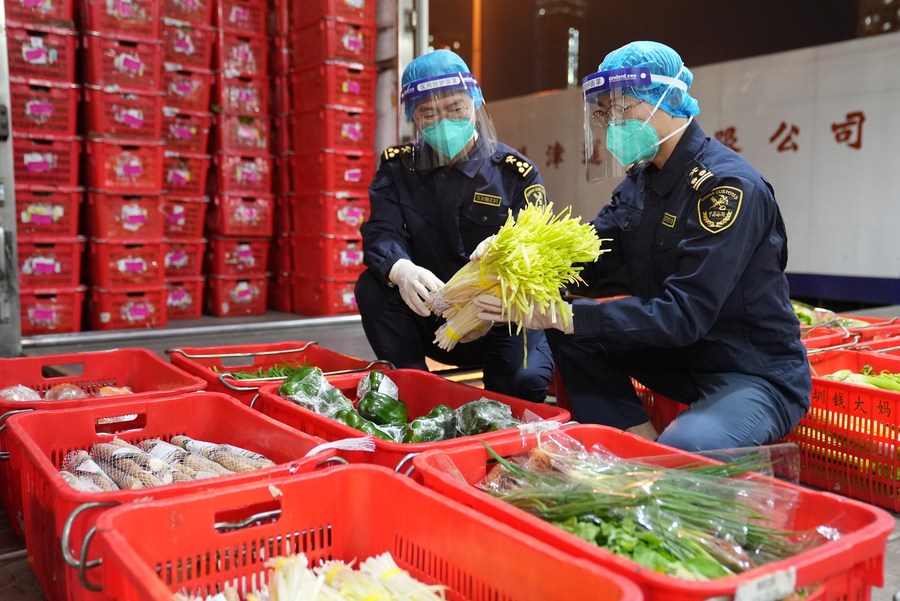 Staff members check vegetables supplying the Hong Kong market in Wenjindu Customs of Shenzhen, south China's Guangdong Province, Feb. 11, 2022. (Xinhua)