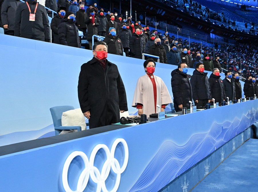 Party and state leaders Xi Jinping, Li Keqiang, Li Zhanshu, Wang Yang, Wang Huning, Zhao Leji, Han Zheng and Wang Qishan attend the closing ceremony of the Beijing 2022 Olympic Winter Games at the National Stadium in Beijing, capital of China, Feb. 20, 2022. (Xinhua/Yue Yuewei)