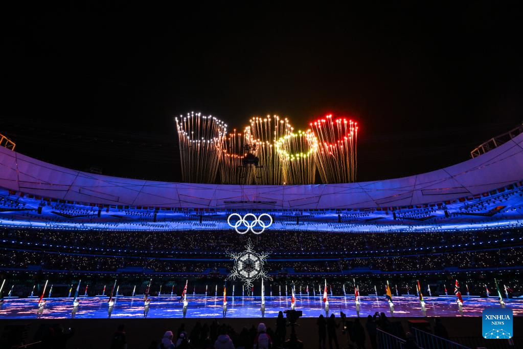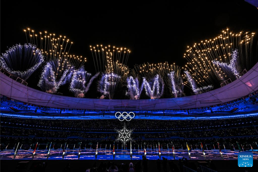 Fireworks illuminate the night sky during the closing ceremony of the Beijing 2022 Olympic Winter Games at the National Stadium in Beijing, capital of China, Feb. 20, 2022. (Xinhua/Cao Can)