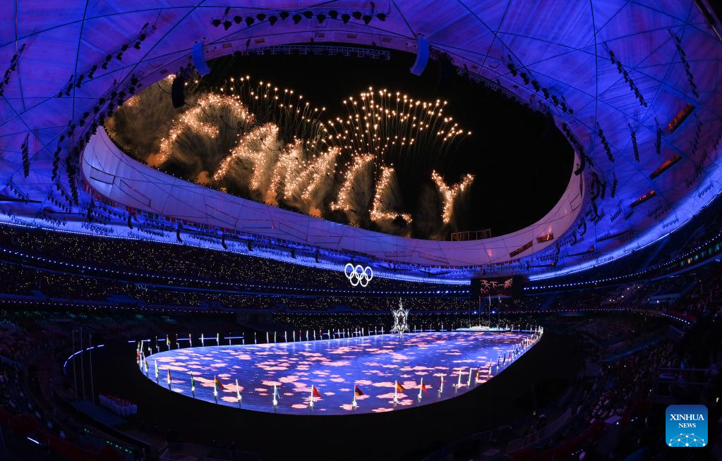 Fireworks illuminate the night sky during the closing ceremony of the Beijing 2022 Olympic Winter Games at the National Stadium in Beijing, capital of China, Feb. 20, 2022. (Xinhua/Li Ga)