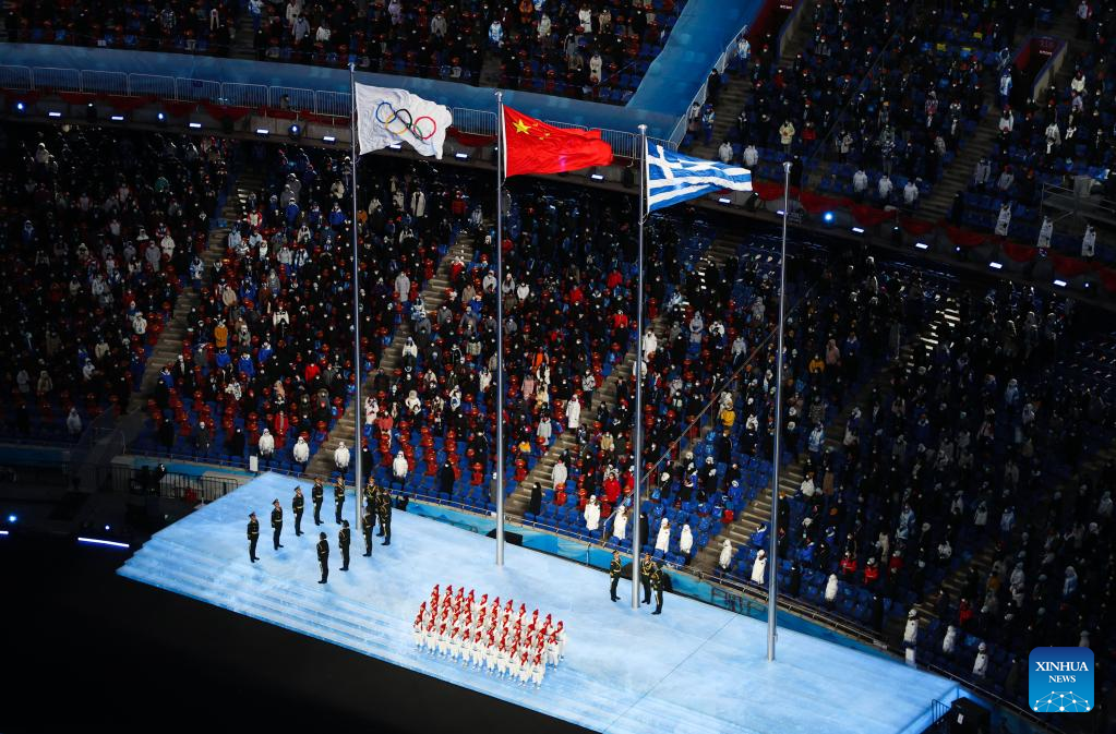 The Olympic flag is lowered during the closing ceremony of the Beijing 2022 Olympic Winter Games at the National Stadium in Beijing, capital of China. (Xinhua/Xu Zijian)