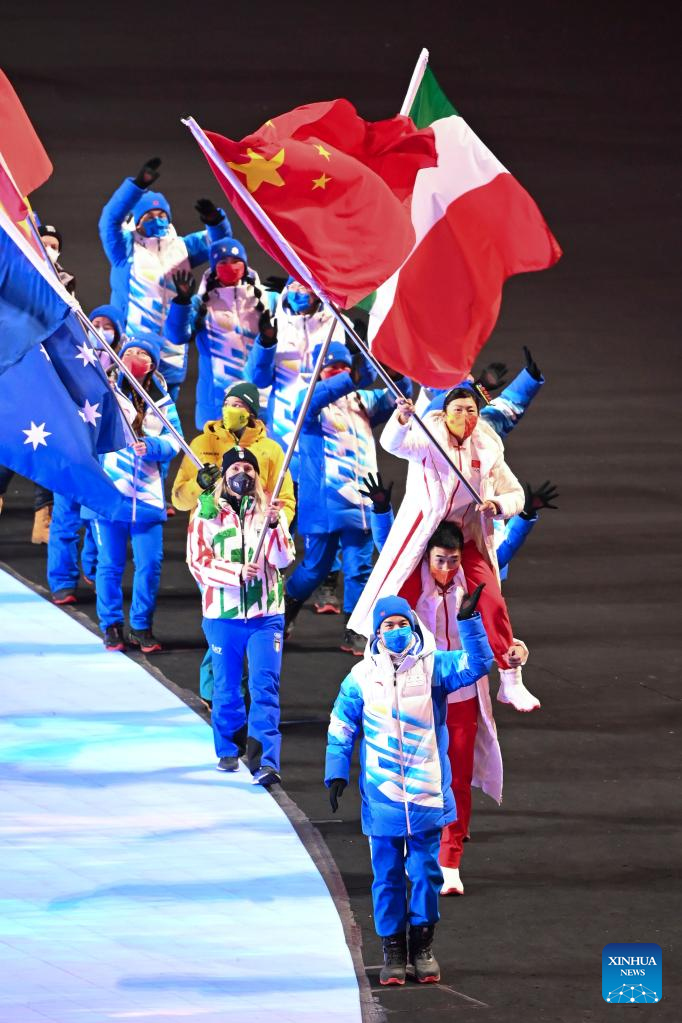 The national flag of Italy is raised during the closing ceremony of the Beijing 2022 Olympic Winter Games at the National Stadium in Beijing, capital of China. (Xinhua/Xu Zijian)