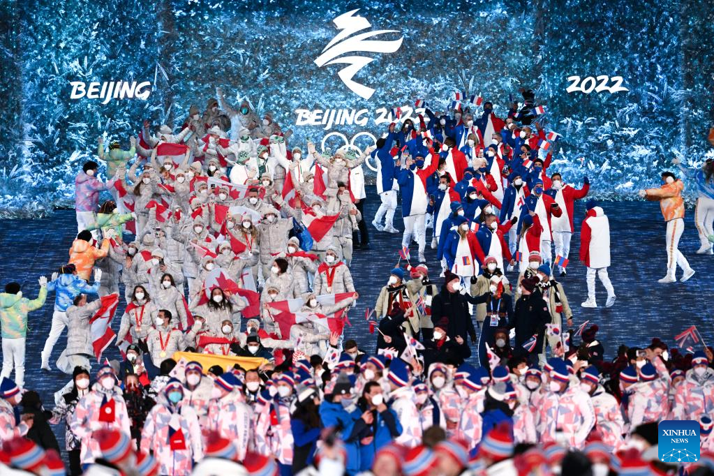 Athletes of delegation of France celebrate during the closing ceremony of the Beijing 2022 Olympic Winter Games at the National Stadium in Beijing, capital of China, Feb. 20, 2022. (Xinhua/Huang Xiaobang)