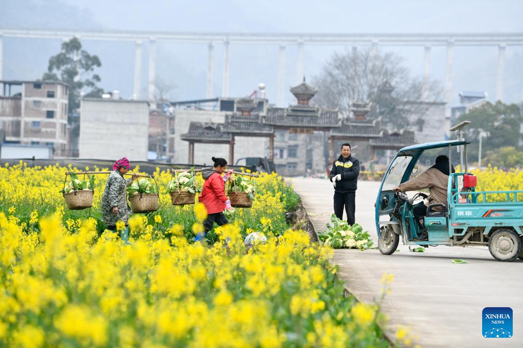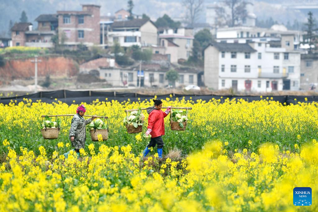 Farmers carry vegetables in the field in Shangpilin Village of Congjiang County, southwest China's Guizhou Province, Feb. 19, 2022. Saturday marks the day of Yushui, or Rain Water, the second of the solar terms. As Yushui arrives, the temperature will rise and rain will become frequent. Farmers across Guizhou are busy with spring agricultural production. (Xinhua/Yang Wenbin)