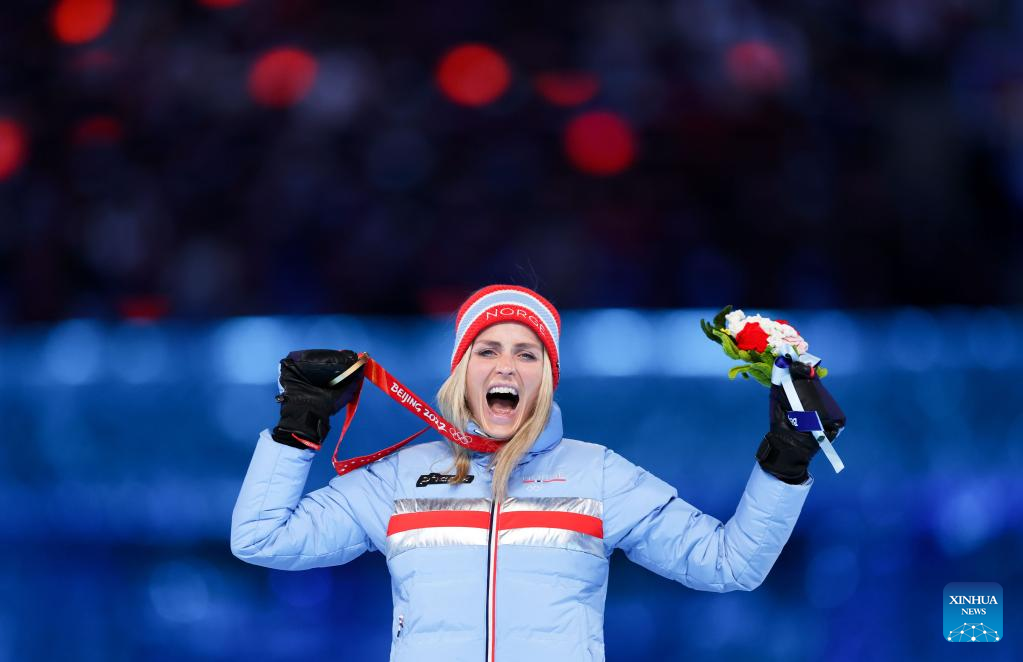 Gold medalist Therese Johaug of Norway reacts during the Victory Ceremony of the cross-country skiing women's 30km mass start free event during the closing ceremony of the Beijing 2022 Olympic Winter Games at the National Stadium in Beijing, capital of China, Feb. 20, 2022. (Xinhua/Cao Can)