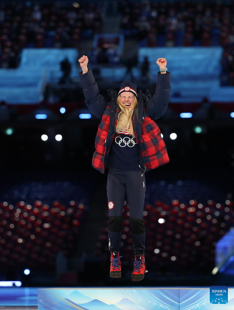 Silver medalist Jessie Diggins of the United States reacts during the Victory Ceremony of the cross-country skiing women's 30km mass start free event during the closing ceremony of the Beijing 2022 Olympic Winter Games at the National Stadium in Beijing, capital of China, Feb. 20, 2022. (Xinhua/Cao Can)