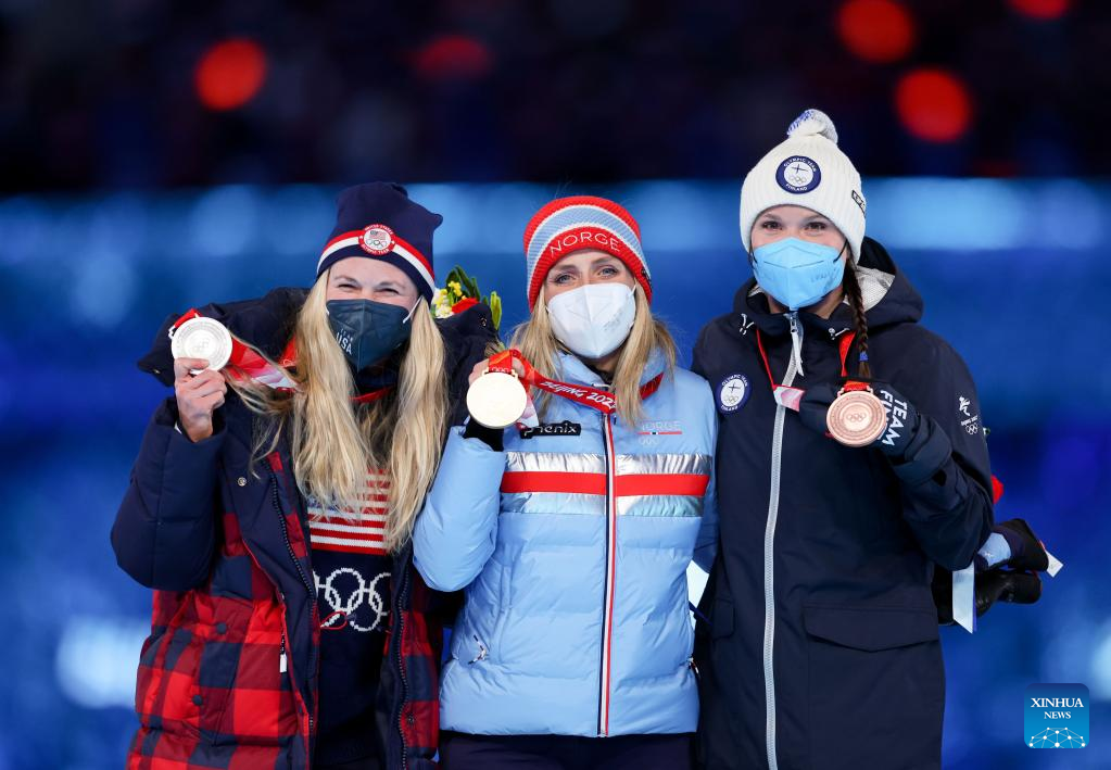 Gold medalist Therese Johaug (C) of Norway, silver medalist Jessie Diggins (L) of the United States and bronze medalist Kerttu Niskanen of Finland react during the Victory Ceremony of the cross-country skiing women's 30km mass start free event during the closing ceremony of the Beijing 2022 Olympic Winter Games at the National Stadium in Beijing, capital of China, Feb. 20, 2022. (Xinhua/Cao Can)