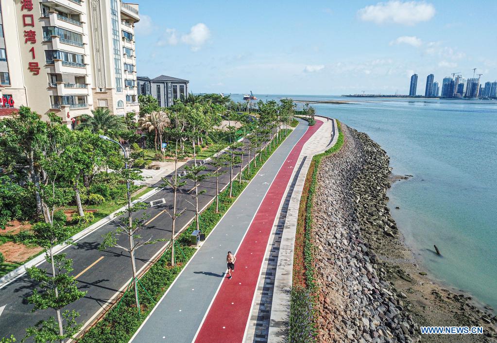 Aerial photo taken on May 3, 2021, shows the Haikou bay seaside walking road in Haikou, capital of South China's Hainan province. [Photo/Xinhua]