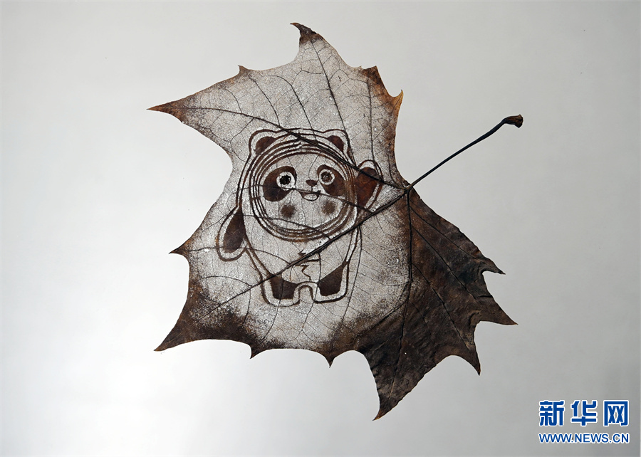 Photo shows a leaf carving work with the pattern of Bing Dwen Dwen, the mascot for the Beijing 2022 Olympic Winter Games, created by Chen Liming. (Photo/Yang Fan)