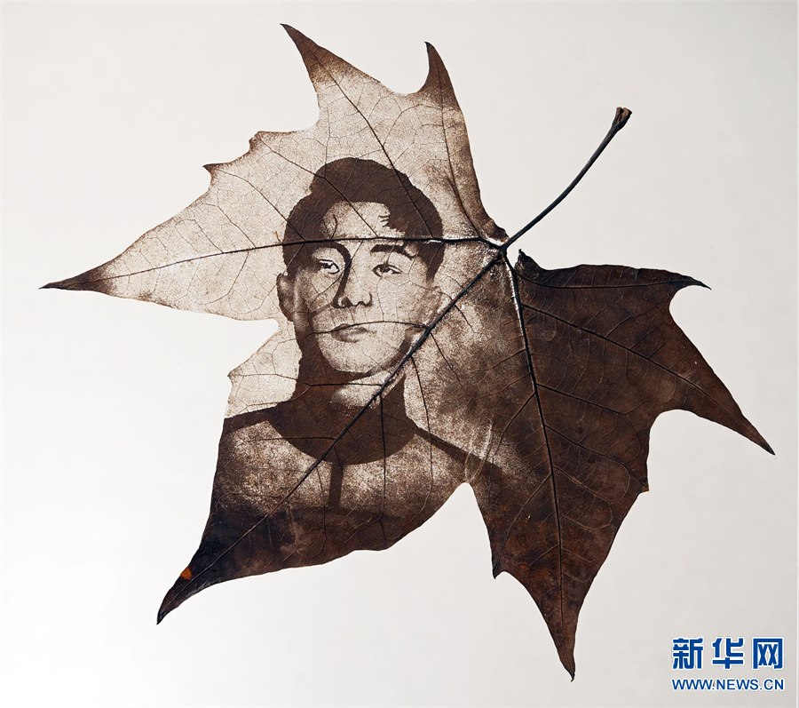 Photo shows Chen Liming’s leaf carving work with an image of Chinese speed skater Wu Dajing. (Photo/Yang Fan)
