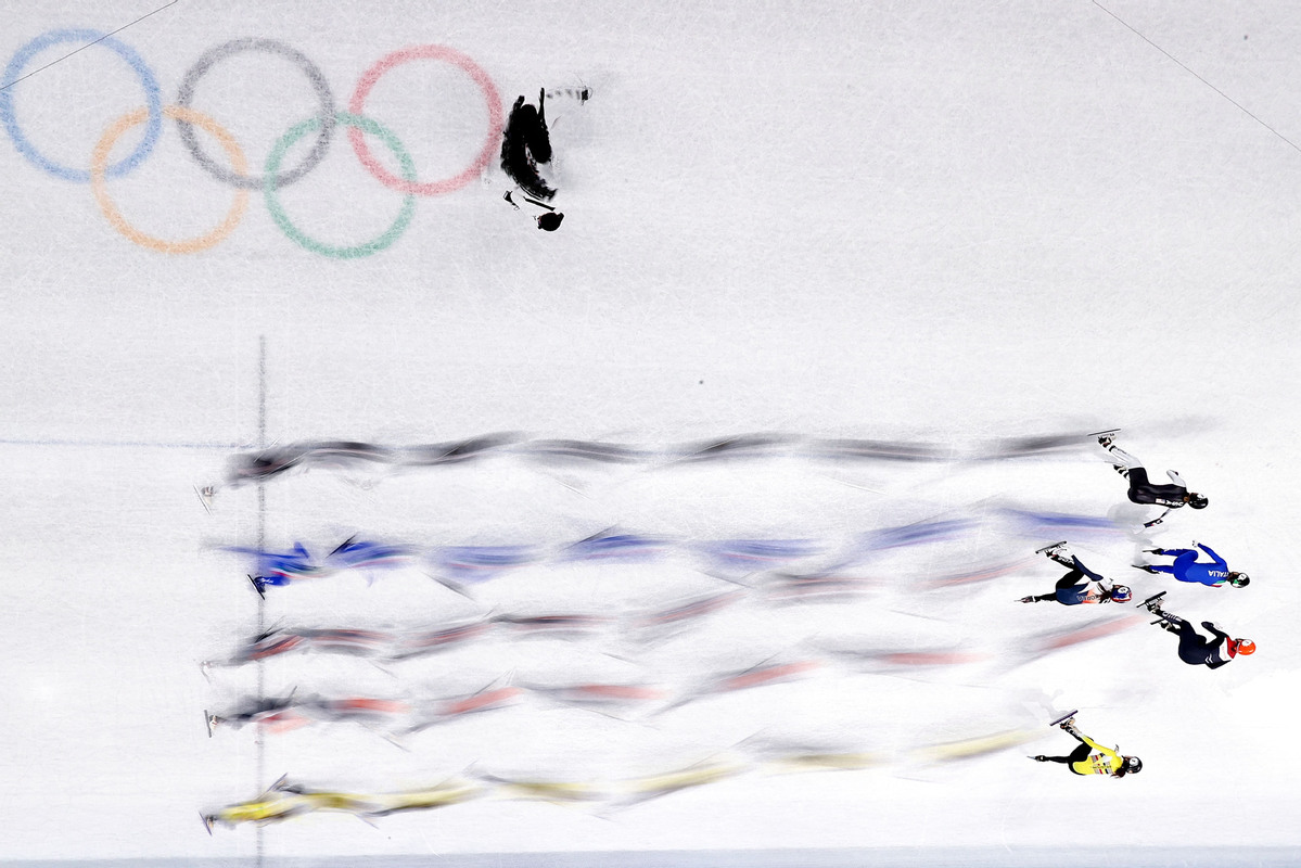 A multiple exposure photo of athletes competing in the short track speed skating women's 1,000m final A at the Capital Indoor Stadium in Beijing on Feb 11. XU ZIJIAN/XINHUA