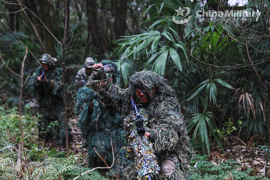 Camouflaged soldiers assigned to a brigade under the PLA 72nd Group Army provide security in turns to cover for the advancement to a mock enemy position during a tactical training course on February 9, 2022. The training aimed at verifying the troops' battle-field reconnaissance capability. (eng.chinamil.com.cn/Photo by Gui Fangqing)