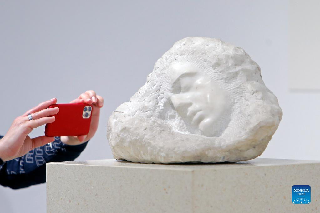 A visitor takes photos of a sculpture at Brancusi hall in Romania's National Museum of Art during the Brancusi Day in Bucharest, Romania, on Feb. 19, 2022. Constantin Brancusi (1876-1957), who spent much of his life in Paris, is considered Romania's most important artist. Feb. 19, the birthday of the sculptor, was declared the Brancusi Day following a law in 2015. (Photo by Cristian Cristel/Xinhua)