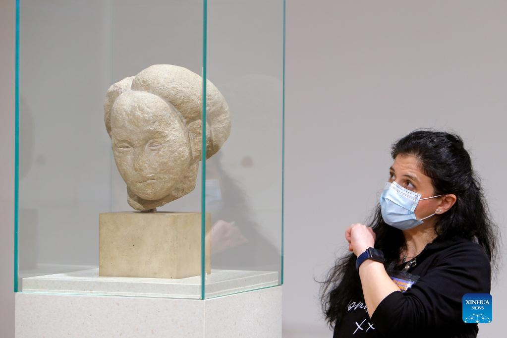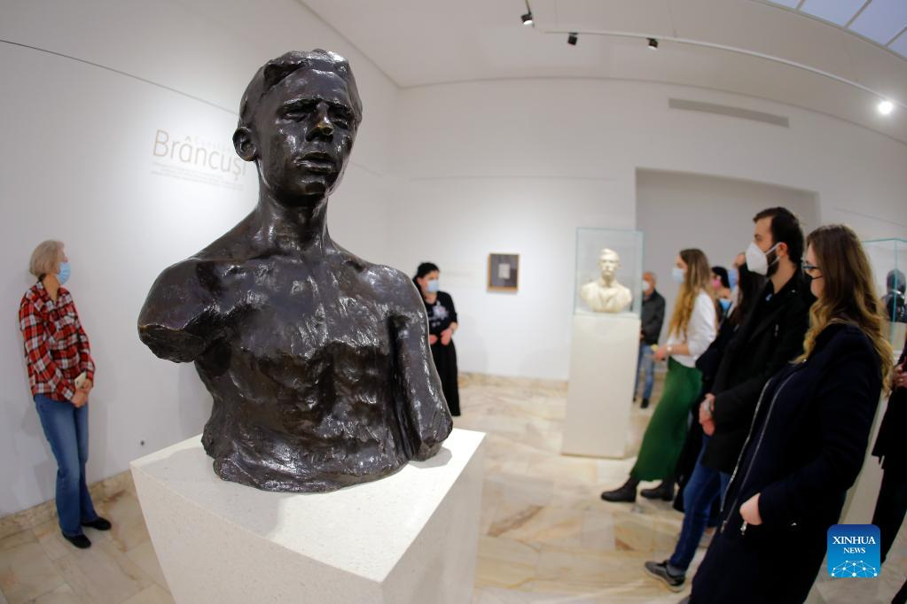 A visitor views a sculpture at Brancusi hall in Romania's National Museum of Art during the Brancusi Day in Bucharest, Romania, on Feb. 19, 2022. Constantin Brancusi (1876-1957), who spent much of his life in Paris, is considered Romania's most important artist. Feb. 19, the birthday of the sculptor, was declared the Brancusi Day following a law in 2015. (Photo by Cristian Cristel/Xinhua)