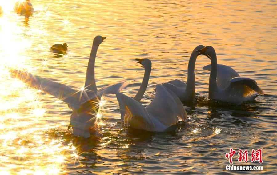 A pair of whooper swans share an intimate moment at Yinghua Lake, Rongcheng city in east China's Shandong Province, Feb. 21, 2022. (Photo: China News Service/Yang Zhili)
