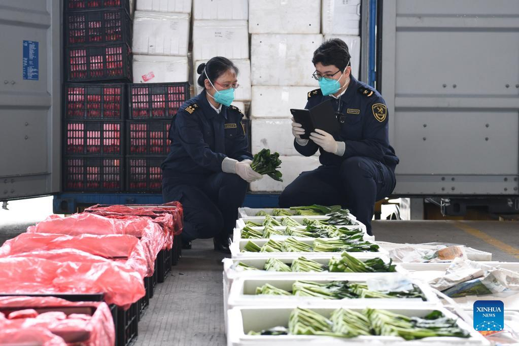 Staff members check vegetable supplies to Hong Kong at Dachanwan wharf of Shenzhen port, south China's Guangdong Province, Feb. 21, 2022. Port zones in Shenzhen have been trying to optimize waterway transport channels for daily supplies to residents in Hong Kong, which is hit by a new round of COVID-19 outbreak. (Xinhua/Liang Xu)