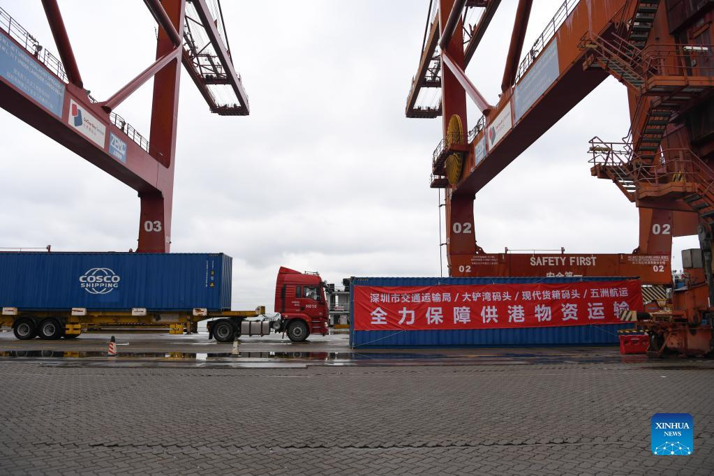 Containers carrying supplies for Hong Kong are seen at Dachanwan wharf of Shenzhen port, south China's Guangdong Province, Feb. 21, 2022. Port zones in Shenzhen have been trying to optimize waterway transport channels for daily supplies to residents in Hong Kong, which is hit by a new round of COVID-19 outbreak. (Xinhua/Liang Xu)