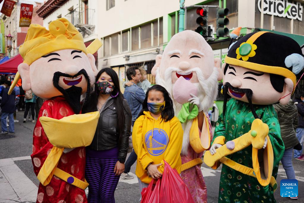 Tourists pose for a photo with actors who dressed as gods of happiness, wealth and longevity respectively during the China town's weekend market in San Francisco, the United States, Feb. 20, 2022. (Xinhua/Wu Xiaoling)