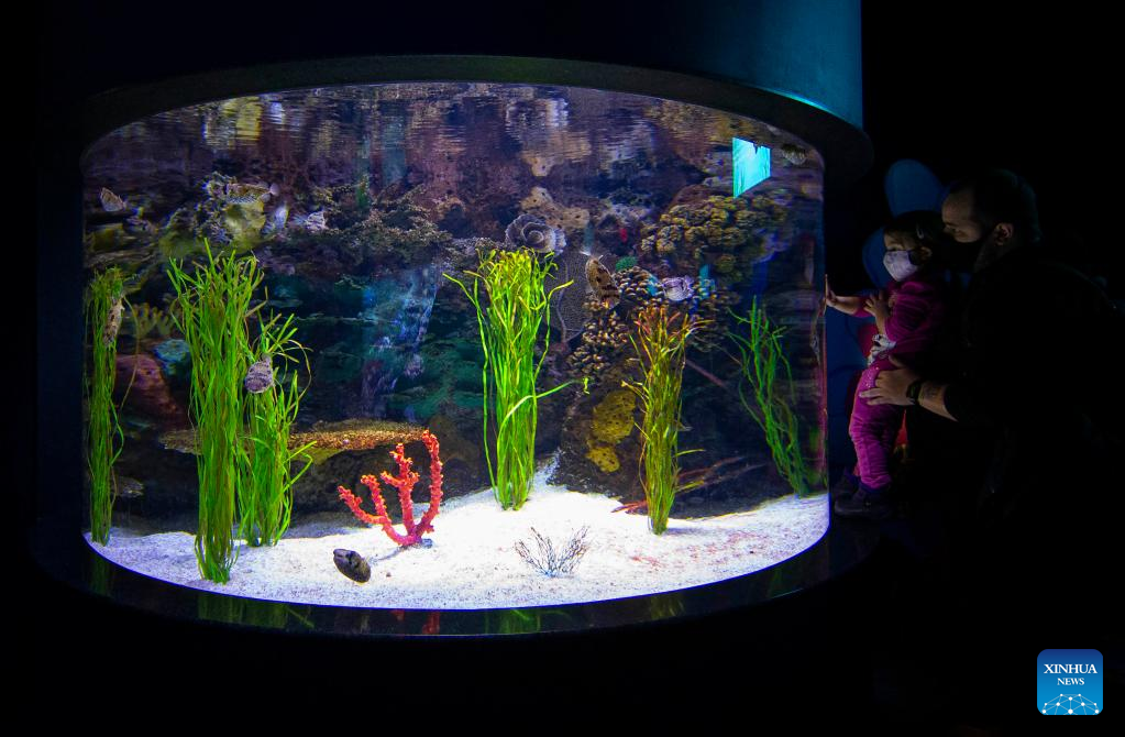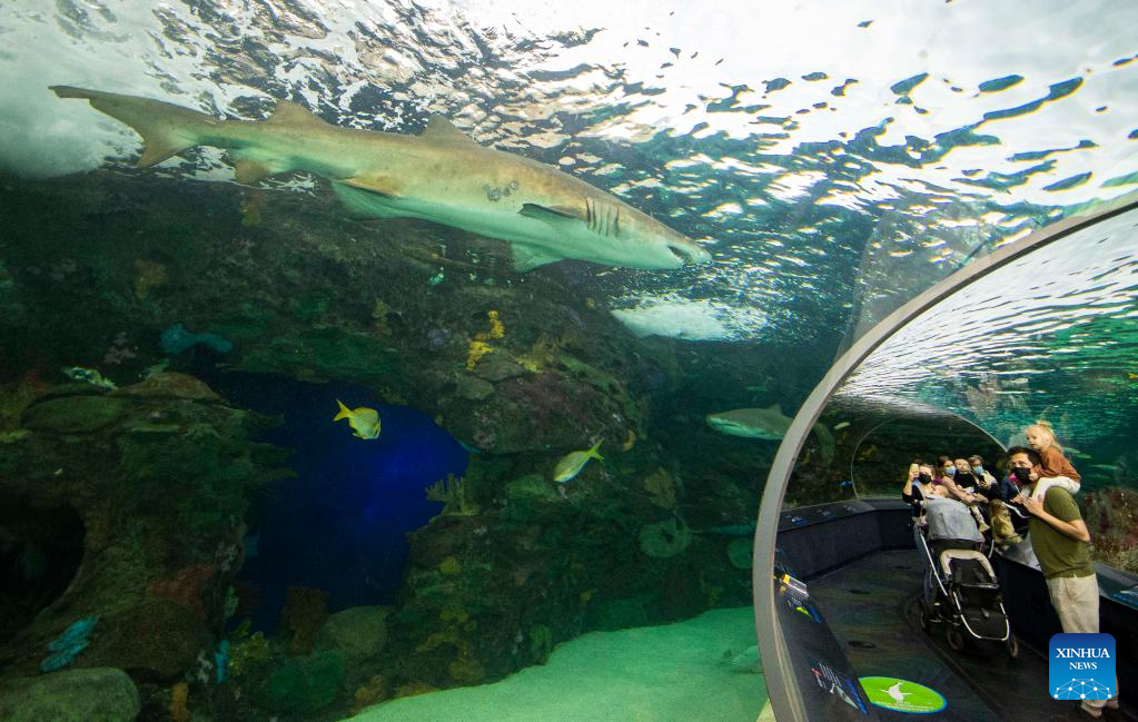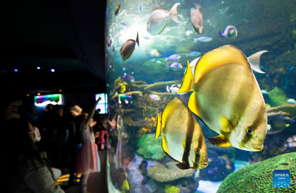 Visitors look at fishes in a water tank at Ripley's Aquarium of Canada in Toronto, Canada, on Feb. 21, 2022. The Ripley's Aquarium of Canada drew many families to celebrate Family Day on Monday. (Photo by Zou Zheng/Xinhua)