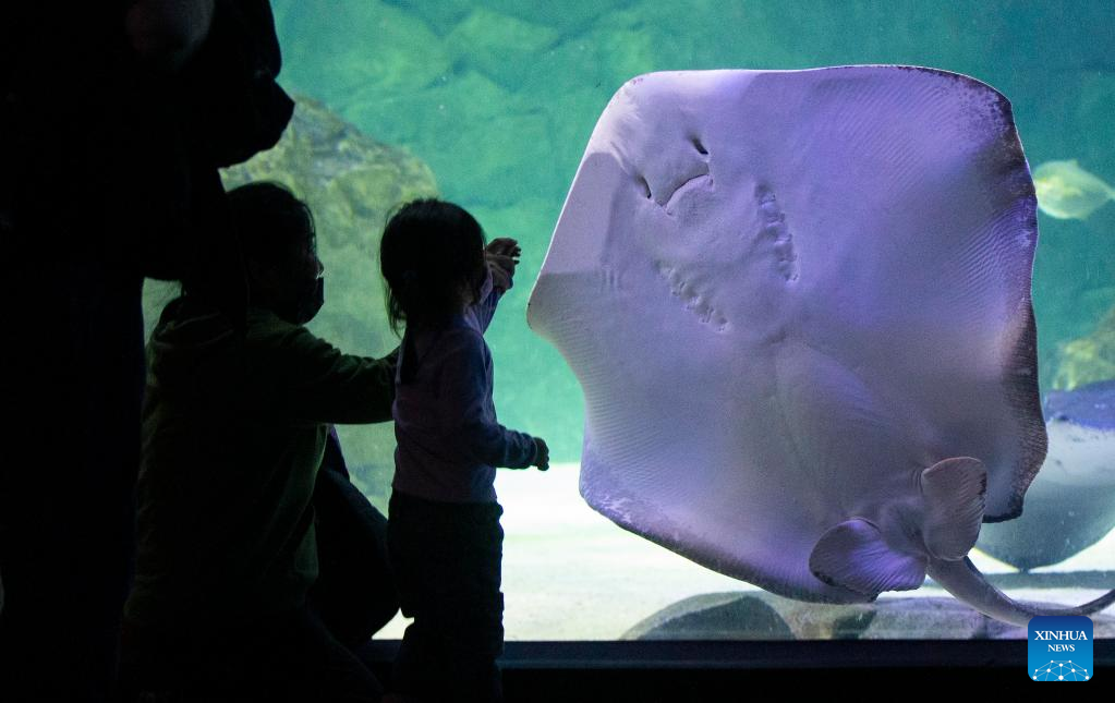 Visitors look at a southern stingray in a water tank at Ripley's Aquarium of Canada in Toronto, Canada, on Feb. 21, 2022. The Ripley's Aquarium of Canada drew many families to celebrate Family Day on Monday. (Photo by Zou Zheng/Xinhua)