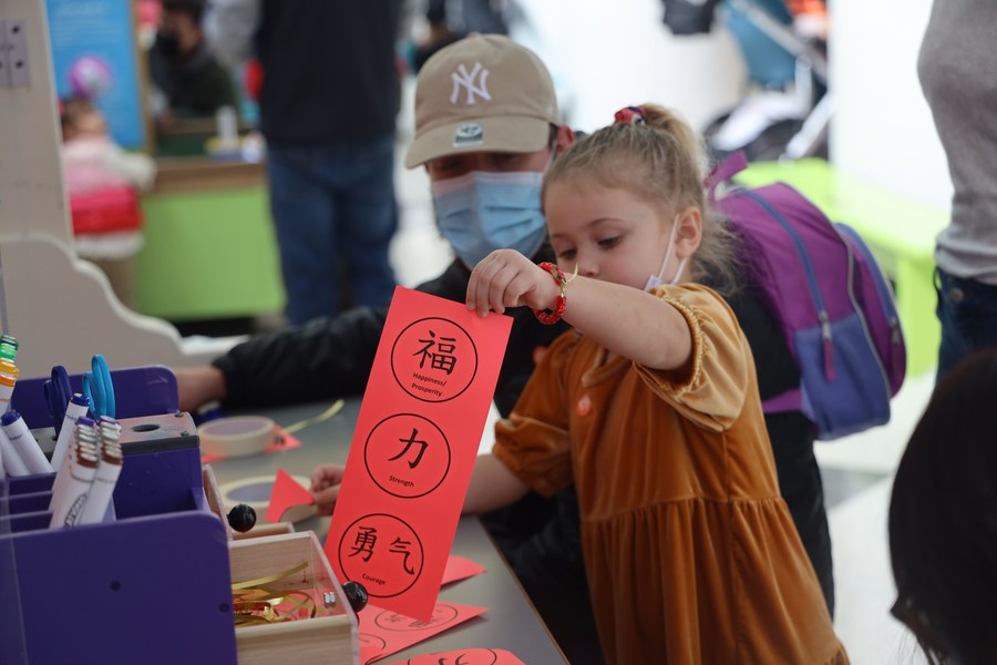 A girl prepares to do paper-cutting of Chinese characters at the Children's Museum of Houston in Houston, Texas, the United States, Feb. 5, 2022. (Xinhua/Xu Jianmei)