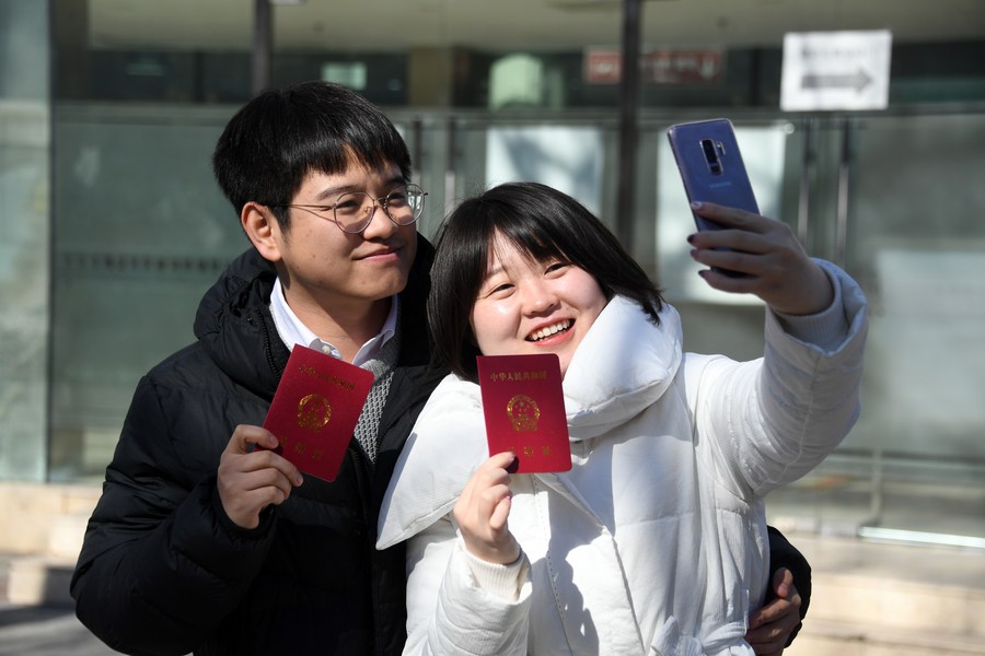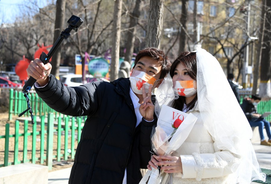 A couple poses for a photo at a marriage registry of Daoli District in Harbin, capital of northeast China's Heilongjiang Province, Feb. 22, 2022. (Xinhua/Zhang Tao)