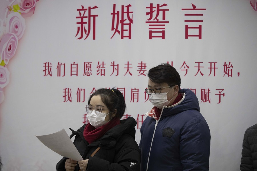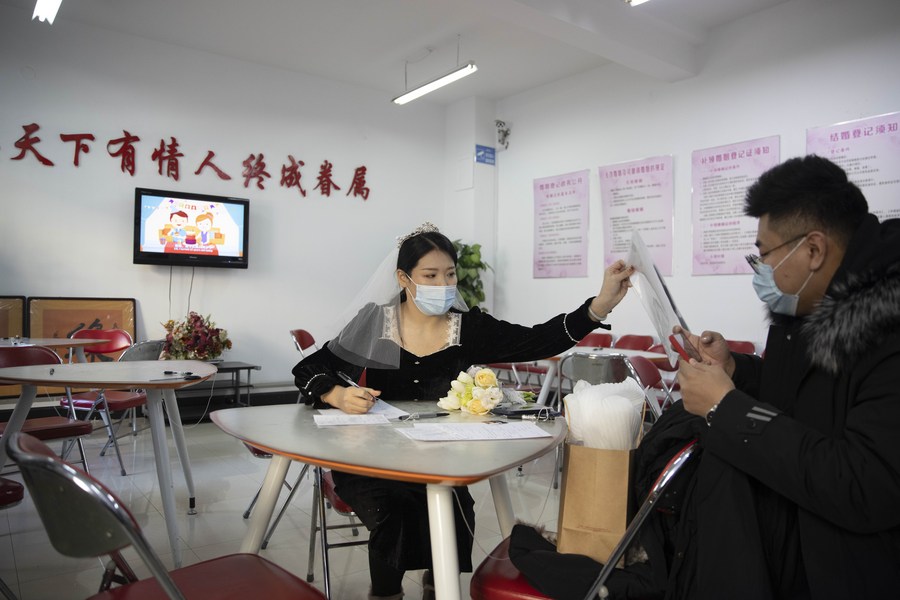 A couple registers marriage at a marriage registry of Daoli District in Harbin, capital of northeast China's Heilongjiang Province, Feb. 22, 2022. (Xinhua/Zhang Tao)