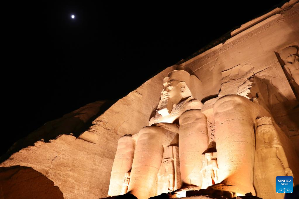 The sculptures of the Great Temple of Abu Simbel are lit up during the Sun Festival in Aswan, Egypt, Feb. 22, 2022. During the Sun Festival, crowds gather before sunrise to observe sunlight lightening the innermost sculptures including King Ramses II. The innermost sculptures remain in darkness inside the Great Temple of Abu Simbel throughout the year except on Feb. 22 and Oct. 22, when the sunlight showers on the sculptures to commemorate the king's coronation and birthday. (Xinhua/Wang Dongzhen)