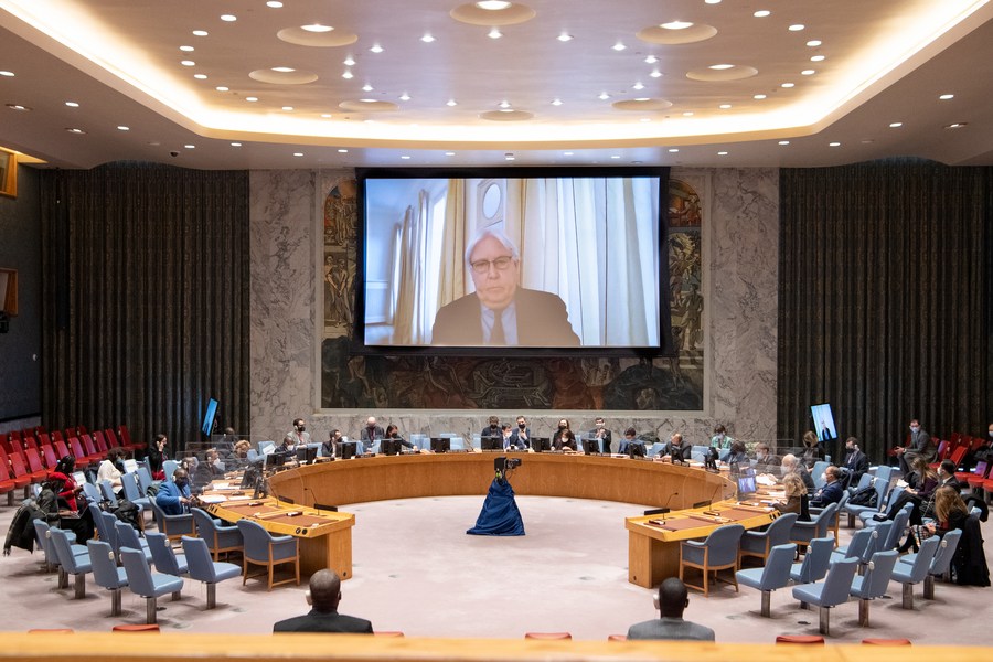 Martin Griffiths, under-secretary-general for humanitarian affairs and emergency relief coordinator, is seen on the screen during the Security Council debate on general issues relating to sanctions at the UN headquarters in New York, Feb. 7, 2022. (Eskinder Debebe/UN Photo/Handout via Xinhua)