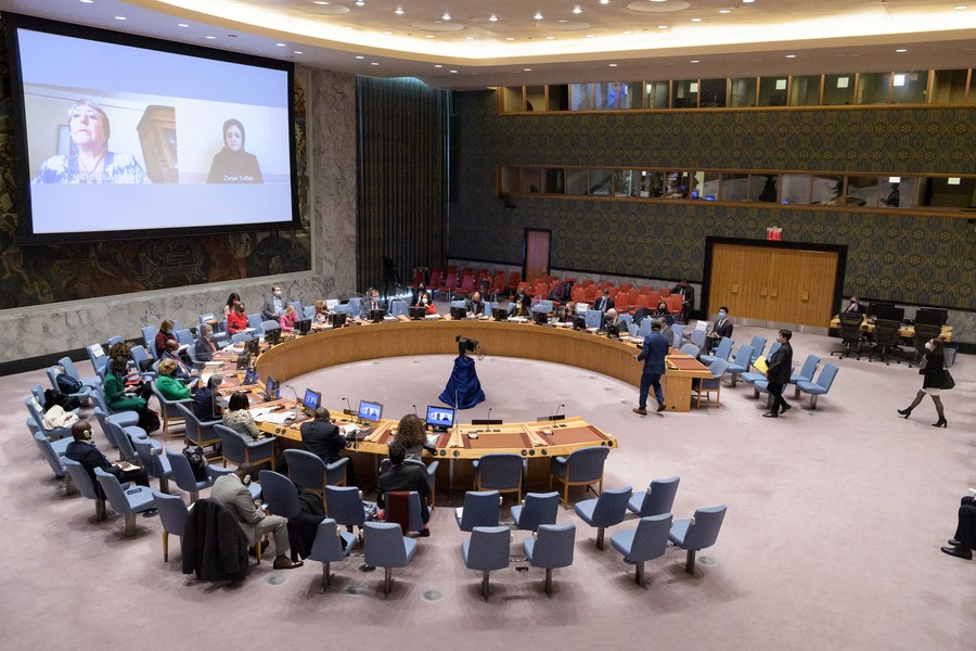 UN High Commissioner for Human Rights Michelle Bachelet (left on screen) speaks via a video link during a Security Council open debate on women, peace and security at UN Headquarters in New York on Jan. 18, 2022. (Manuel Elias/UN Photo/Handout via Xinhua)