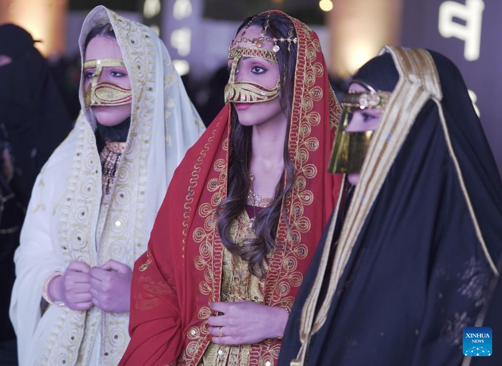 (220222) -- DAMMAM (SAUDI ARABIA), Feb. 22, 2022 (Xinhua) -- Women wearing traditional clothes are seen during the first kingdom's Founding Day celebrations in Dammam, Saudi Arabia, on Feb. 22, 2022. (Photo by Mohamed Nasr/Xinhua)