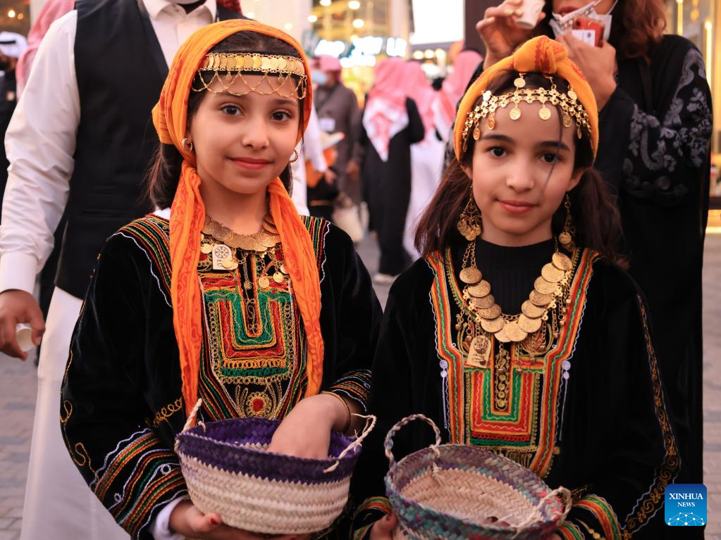 Girls wearing traditional abaya and headwear are seen during the first kingdom's Founding Day celebrations in Abha, Saudi Arabia, on Feb. 22, 2022. (Xinhua/Wang Haizhou)