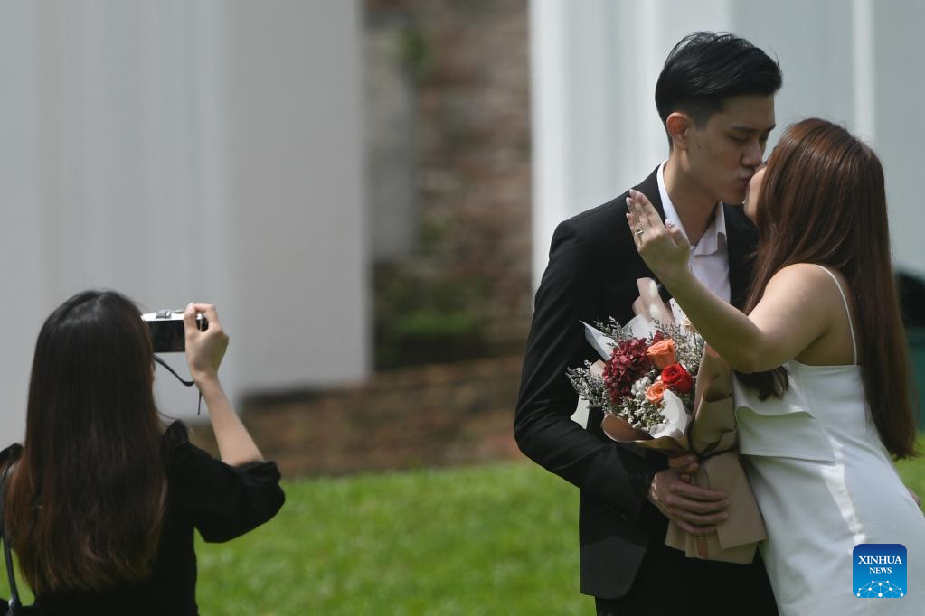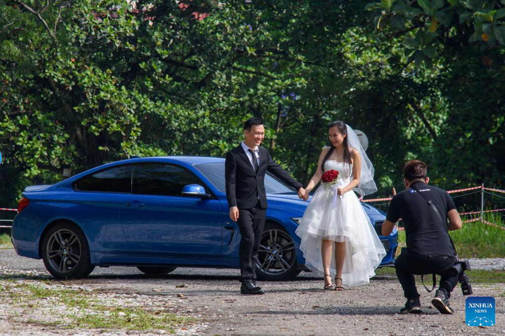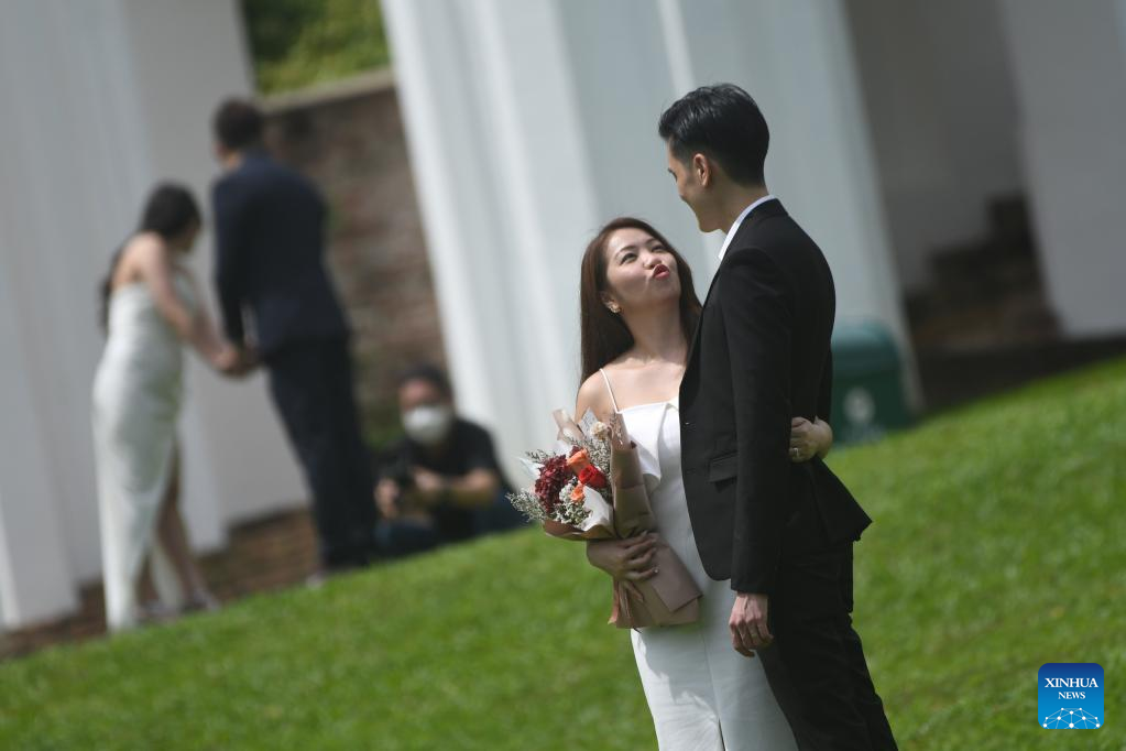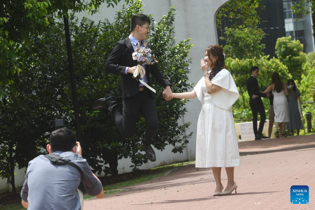 A newly-wedded couple pose for photos in Fort Canning Park, after marriage registration at the nearby Registry of Marriage in Singapore on Feb. 22, 2022.