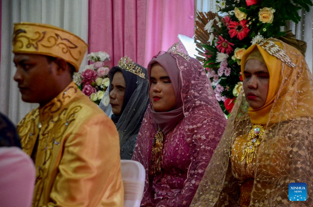 Blind brides and grooms sit during a wedding ceremony in Bogor, West Java, Indonesia, Feb. 22, 2022. Three local blind couples chose to get married on Feb. 22, 2022, a palindrome day they consider as once-in-a-lifetime and worth cherishing. (Photo by Sandika Fadilah/Xinhua)