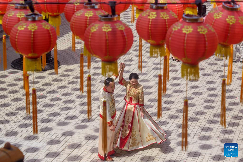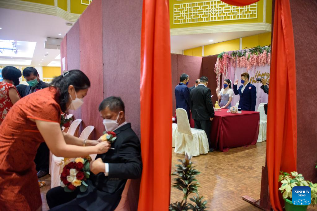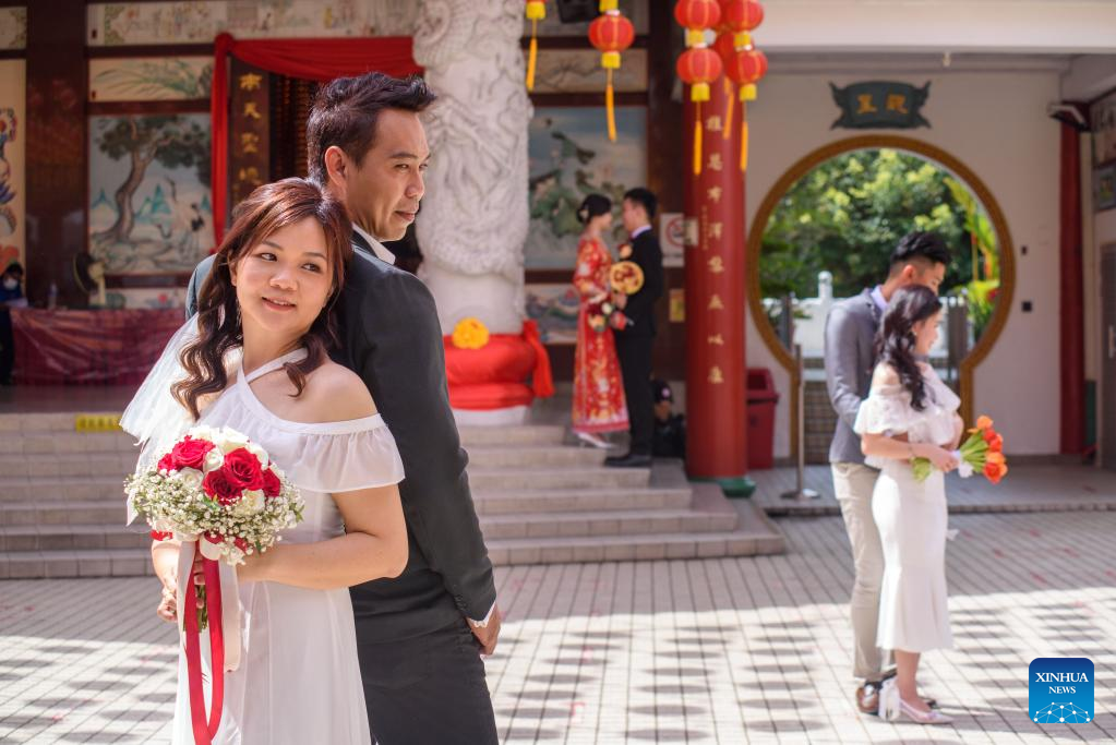 Newlywed couples register their marriage at Thean Hou Temple in Kuala Lumpur, Malaysia, Feb. 22, 2022. Many local couples chose to register their marriage on Feb. 22, 2022, a palindrome day they deem as rare and auspicious. (Photo by Chong Voon Chung/Xinhua)