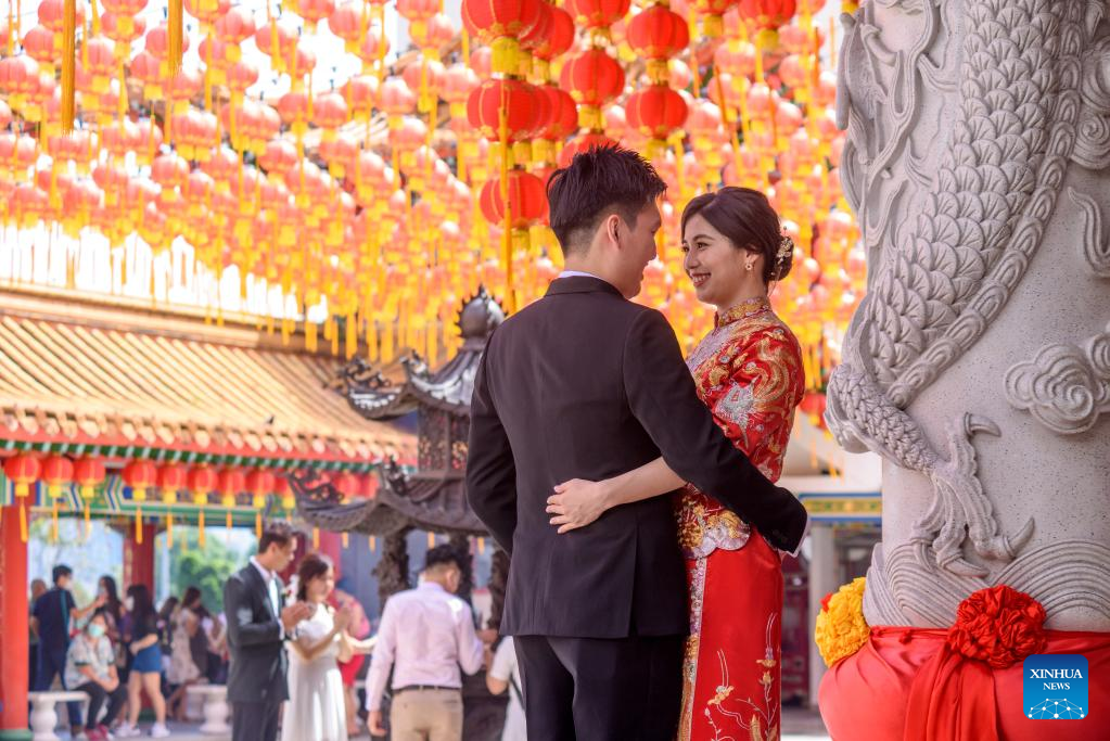 A newlywed couple pose for photos after marriage registration at Thean Hou Temple in Kuala Lumpur, Malaysia, Feb. 22, 2022. Many local couples chose to register their marriage on Feb. 22, 2022, a palindrome day they deem as rare and auspicious. (Photo by Chong Voon Chung/Xinhua)