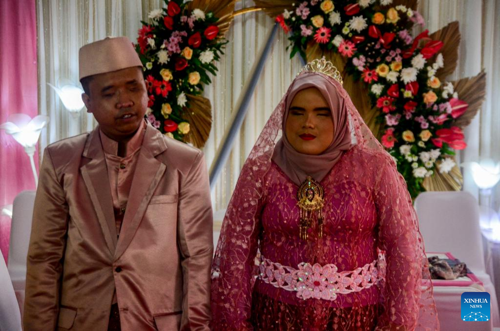 A blind couple pose for photos after their wedding ceremony in Bogor, West Java, Indonesia, Feb. 22, 2022. Three local blind couples chose to get married on Feb. 22, 2022, a palindrome day they consider as once-in-a-lifetime and worth cherishing. (Photo by Sandika Fadilah/Xinhua)
