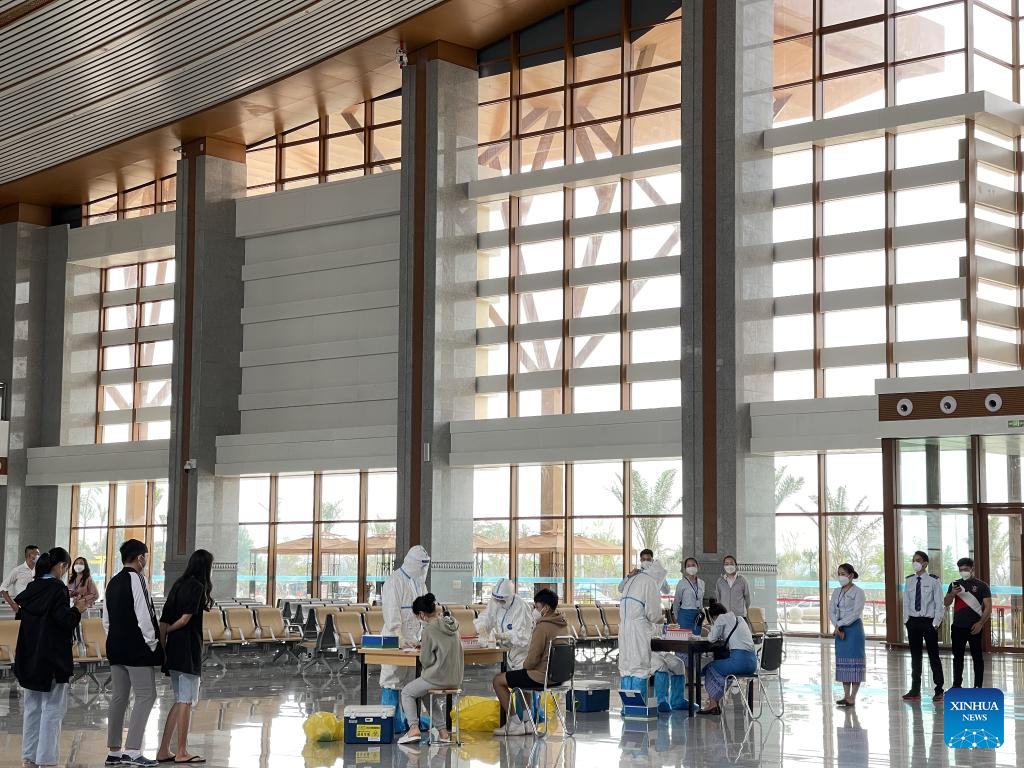 A team of Chinese medical personnel provide emergency testing services at the training center of the China-Laos Railway, in Lao capital Vientiane on Feb. 19, 2022, contributing to the railway's safe and stable operation. (Photo by Yang Sheng/Xinhua)