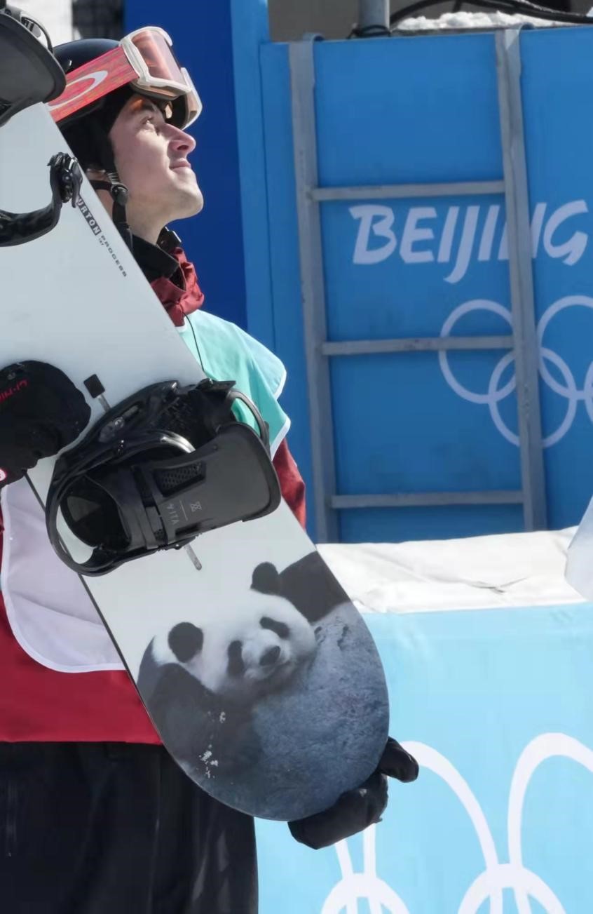 Canadian snowboarder Mark Lee McMorris holds his snowboard with the pattern of a giant panda. (People’s Daily/ Li Ge)