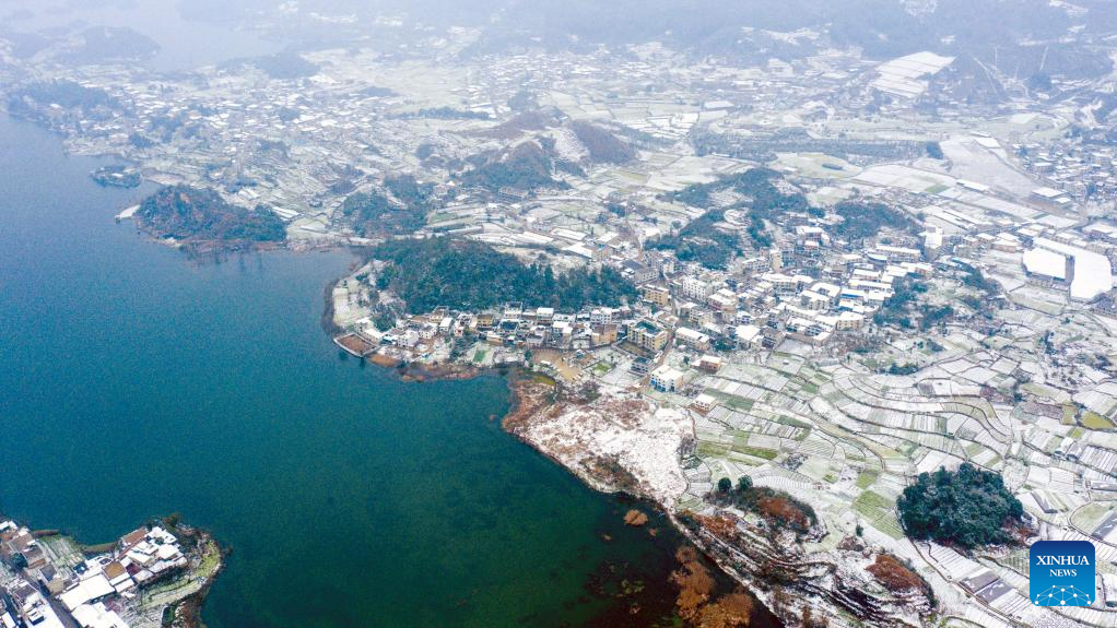 Aerial photo taken on Feb. 22, 2022 shows the snow scenery of the Aha Lake National Wetland Park in Guiyang City, southwest China's Guizhou Province.