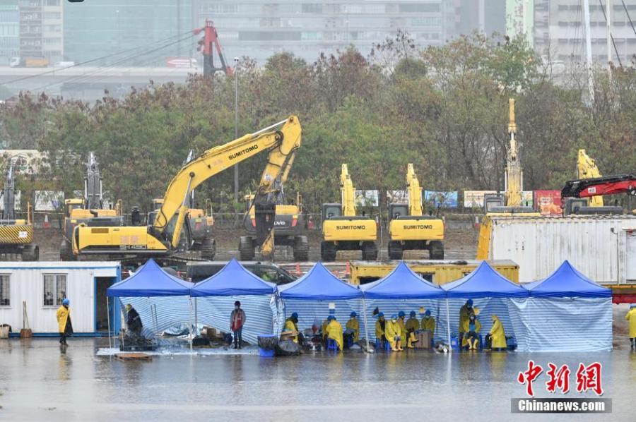 Photo taken on Feb. 22, 2022 shows the construction site of a community isolation and treatment facility for COVID-19 patients at Kai Tak Cruise Terminal, south China's Hong Kong Special Administrative Region. (Photo: China News Servince/Li Zhihua)