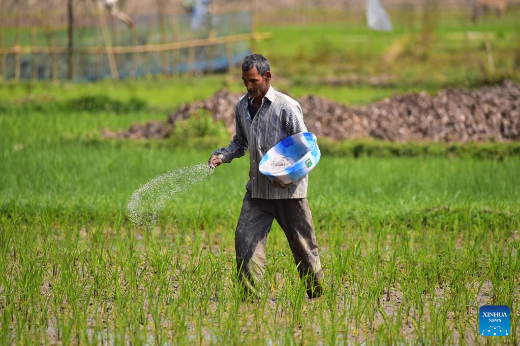 A farmer sprays fertilizer at a paddy field in Mayong village, Morigaon district of India's northeastern state of Assam, Feb. 22, 2022. (Str/Xinhua)