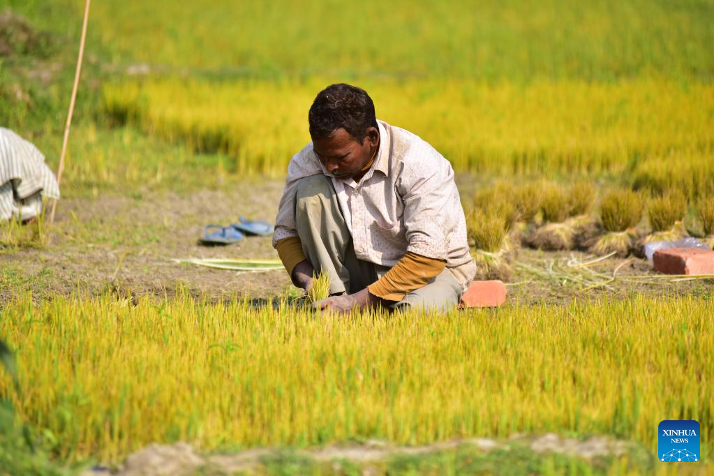 Farmers uproot rice seedlings at a paddy field in Mayong village, Morigaon district of India's northeastern state of Assam, Feb. 22, 2022. (Str/Xinhua)