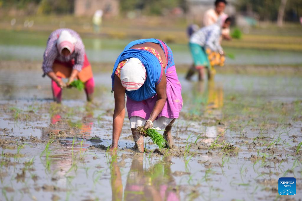 Women plant rice saplings at a paddy field in Mayong village, Morigaon district of India's northeastern state of Assam, Feb. 22, 2022. (Str/Xinhua)